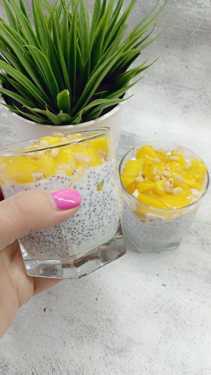 Низкоуглеводный десерт с высоким содержанием клетчатки 150 гр несладкого йогурта (кокосового молока) Подсластитель по вкусу 2ч.л семена чиа 2 ст.л.манго (можно банан, любую ягоду, яблоко, грушу, детское фруктовое пюре и даже варенье, если у вас не проблем с углеводами...) Орешки для украшения