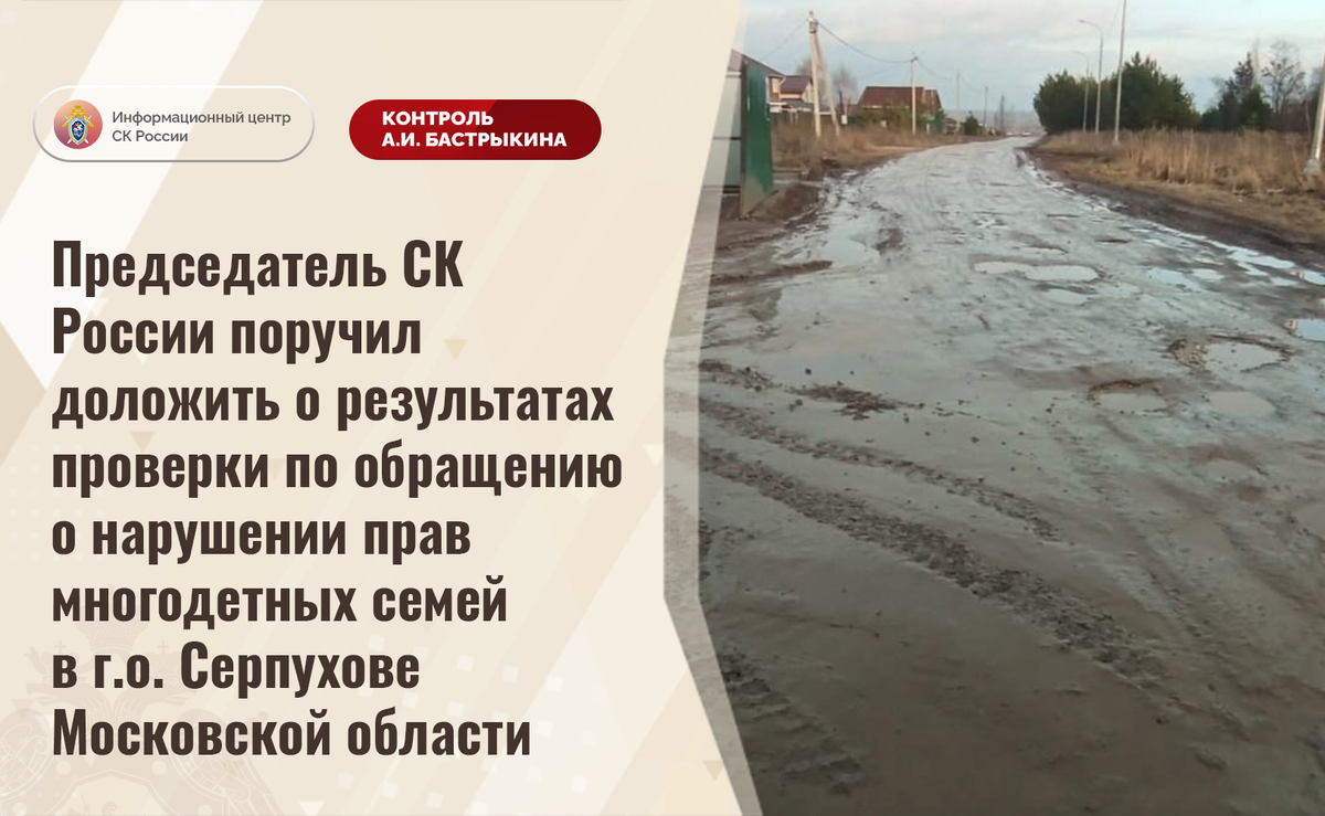 Председатель СК России поручил доложить о результатах проверки по обращению о нарушении прав многодетных семей в г.о. Серпухове Московской области В комментариях в аккаунте приёмной Председателя СК России А.И. Бастрыкина «ВКонтакте» размещено обращение по вопросу нарушения прав многодетных семей в городском округе Серпухове Московской области. Несколько лет назад гражданам выданы земельные участки на территории города Пущино без необходимых коммуникаций и инфраструктуры. Местные жители ежедневно испытывают трудности при передвижении по неасфальтированной дороге. Несмотря на наличие вступившего в законную силу судебного решения, до настоящего времени указанные нарушения не устранены. Ранее указанная ситуация освещалась в СМИ. А.И. Бастрыкин поручал представить по ней доклад. В ГСУ СК России по Московской области проводилась процессуальная проверка. Председатель Следственного комитета Российской Федерации Александр Иванович Бастрыкин поручил руководителю ГСУ СК России по Московской облас