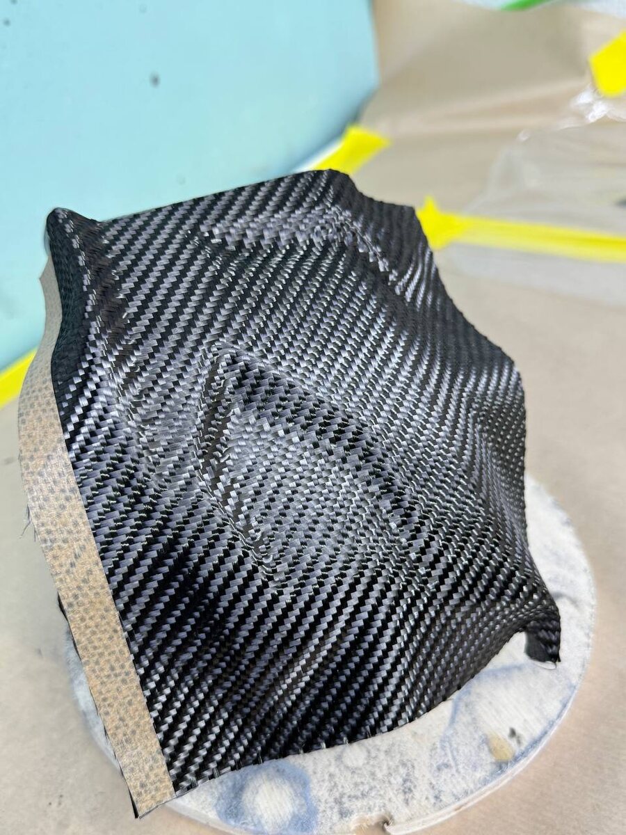 Это был самый простой, непримечательный мотошлем. До того момента, пока мы не заламинировали нижнюю часть в классическое плетение «Твил» По желанию клиента был сделан стык «Ёлочка» по центру А так же эмблемы и серые полоски были покрашены в черный мат