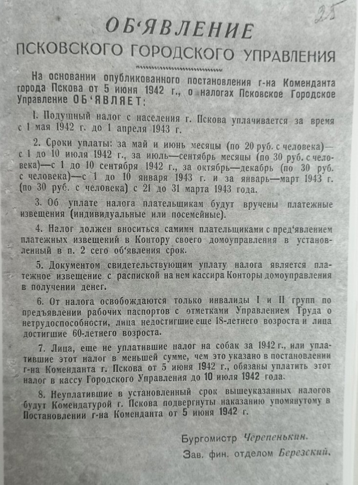 Например, в Пскове налоги были введены в первые дни оккупации.