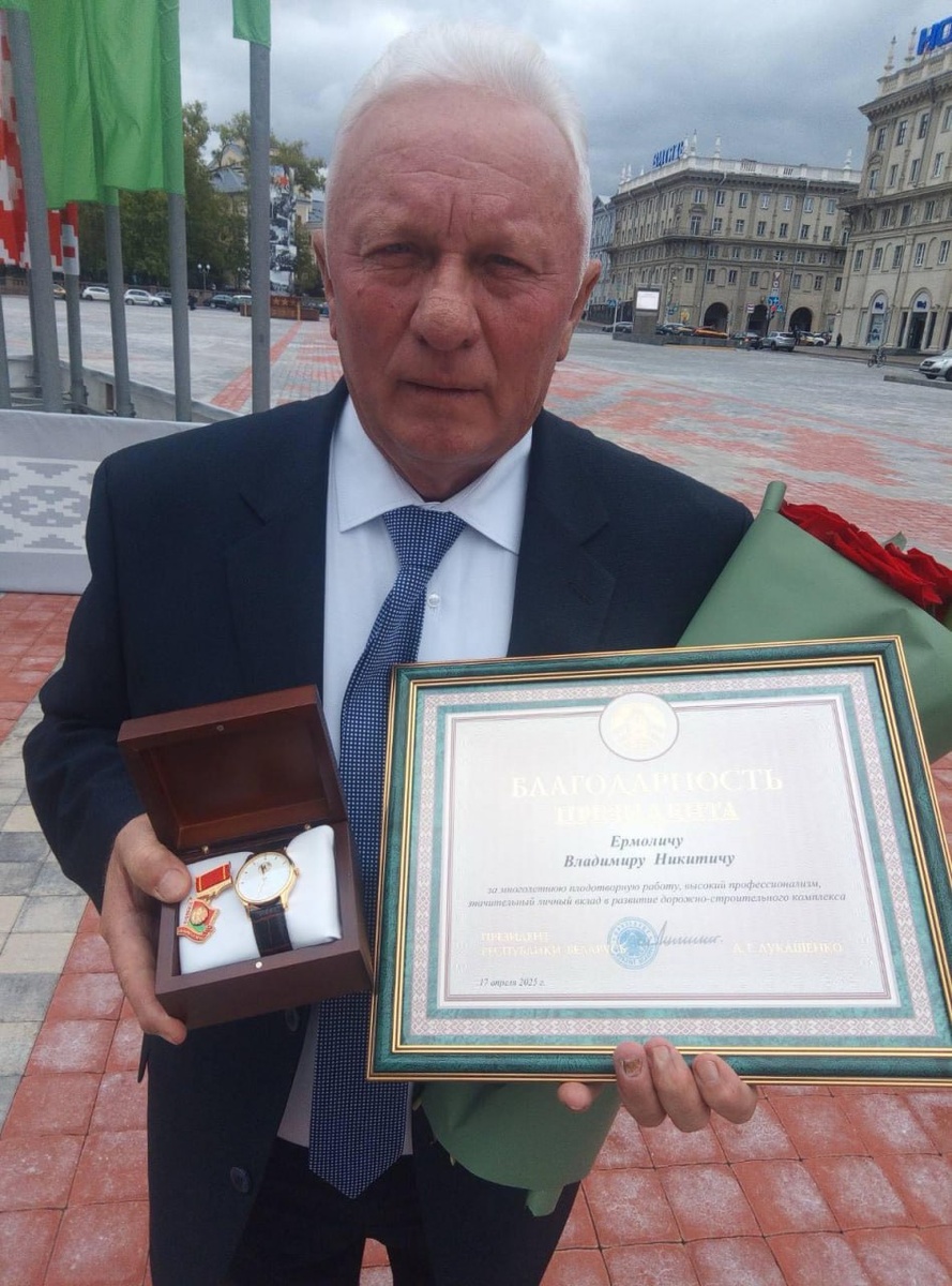 Сегодня Благодарность Президента Республики Беларусь машинисту укладчика асфальтобетона Столинской ДСПМК-32 Владимиру Ермоличу вручил