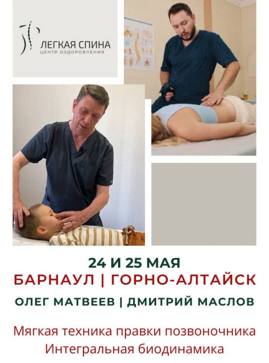 💥БАРНАУЛ 💥ГОРНО-АЛТАЙСК Открыта запись к специалистам центра Легкая Спина в ваших городах. Если вы страдаете: 🔸бессонницей, тревожностью, депрессией 🔸 головными болями и мигренями 🔸 болями в шее, спине и пояснице 🔸 сколиозом, остеохондрозом и грыжами 🔸 проблемами с суставами вам обязательно нужно записаться на прием. Специалисты центра работают при помощи: 🌿 ударной и мягкой методик правки позвоночника 🌿 интегральной биодинамики и биомеханики Благодаря этому: ✅ выстраиваются в анатомически правильное положение позвонки ✅ нормализуется работа лимфатической системы ✅ мышцы и фасции приходят в тонус, уходят зажимы и напряжение в организме 📍 Барнаул - 24 мая 📍 Горно-Алтайск - 25 мая ✍️ Запись по телефону + 7 (926) 495-29-42 с 10:00 до 20:00 по московскому времени