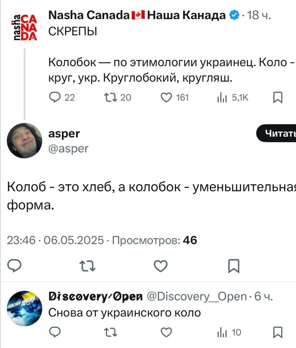 Дорогие мои друзья и товарищи, новость в свете текущих событий ничуть не удивительна, но все же, все же, все же.... Обитатели чрезвычайно незалежнего государства считают, что русская народная сказка «Колобок», вовсе не русская. а сами знаете чья. Авторства удивительного на всю голову народа, выкопавшего Черное море. И сам герой этой сказки тоже того же самого происхождения, а бездарные русские, в силу своей злочинности, взяли и звизданули его у даровитых копателей Черного моря, чье имя сейчас и называть не стоит из-за неудовольствий админов. Таки для чересчур даровитых копателей на всякий случай разъясняю: Само слово «коловрат» имеет русское происхождение и с древнеславянского переводится как «вращение колеса», «круговорот» (коло – круг, колесо, врат – ворот – вращение). Однако древние славяне называли словом «коло» не только колесо, но и использовали его в качестве эпитета Солнца («наше солнышко – колоколнышко»). Отсюда другое название коловрата – Солцеворот Символом которого были ис