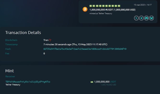 🪙 Tether напечатали 1 млрд USDT на блокчейне Tron