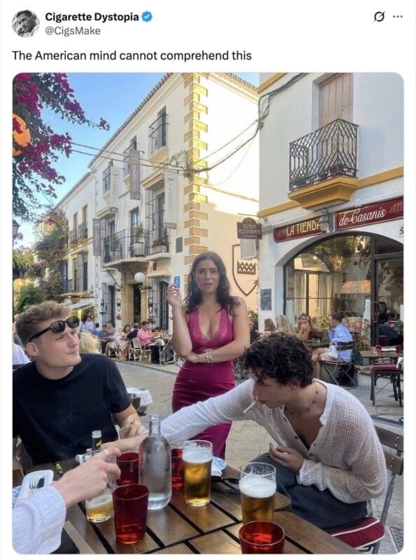 На платформе X (ранее Twitter) стало популярным фото двух молодых мужчин, курящих сигареты и пьющих пиво, в то время как женщина позирует рядом. Момент завоевал внимание пользователей и привел к обсуждению культурных различий между Америкой и Европой. Пост с подписью: «Американский ум не может это осознать» появился на платформе 25 апреля от аккаунта «Cigarette Dystopia» и вызвал бурные обсуждения о том, как в разных частях света воспринимаются повседневные сцены. Это изображение было сделано на одной из популярных улиц в старом городе Марбельи, Испания, и изображает привлекательную молодую женщину в откровенном платье, курящую сигарету, а также двоих мужчин, наслаждающихся пивом и сигаретами за столиком. Данная фотография отлично иллюстрирует расслабленную атмосферу европейской кафе-культуры, за которую известны такие страны, как Испания, Греция, Италия и Франция. Эта традиция восходит к 17 веку и часто включает в себя потребление кофе, алкоголя и сигарет. Однако прикрепленная к фото