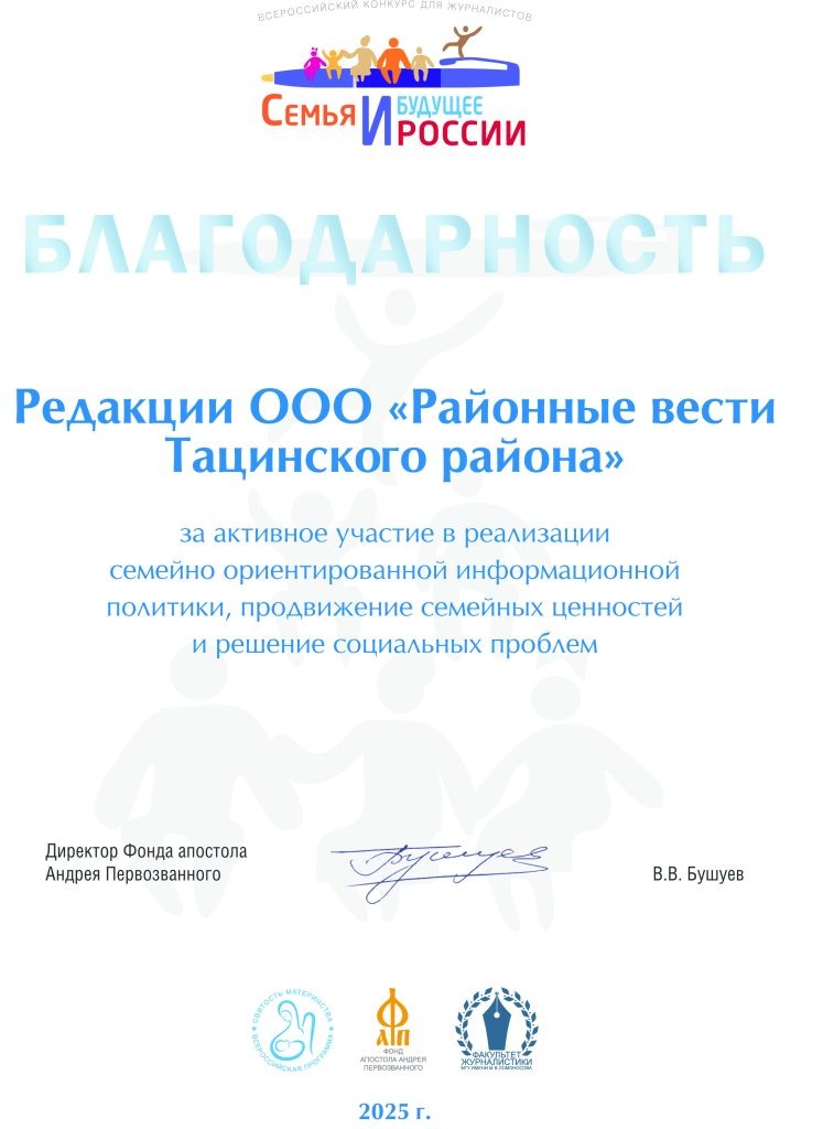 Благодарность поступила от Фонда апостола Андрея Первозванного. Сотрудники газеты «Районные вести» ежегодно участвуют во Всероссийском конкурсе журналистов «Семья и будущее России», организованном Фондом апостола Андрея Первозванного. Цель конкурса — пропаганда семейных ценностей, диалога поколений, ответственного отцовства. В 2025 году в редакцию «Районных вестей» поступила Благодарность «за активное участие в реализации семейно ориентированной информационной политики, продвижение семейных ценностей и решение социальных проблем» за подписью Владимира Бушуева, директора Фонда апостола Андрея Первозванного. Эта Благодарность займет почетное место среди других наград тацинских журналистов.