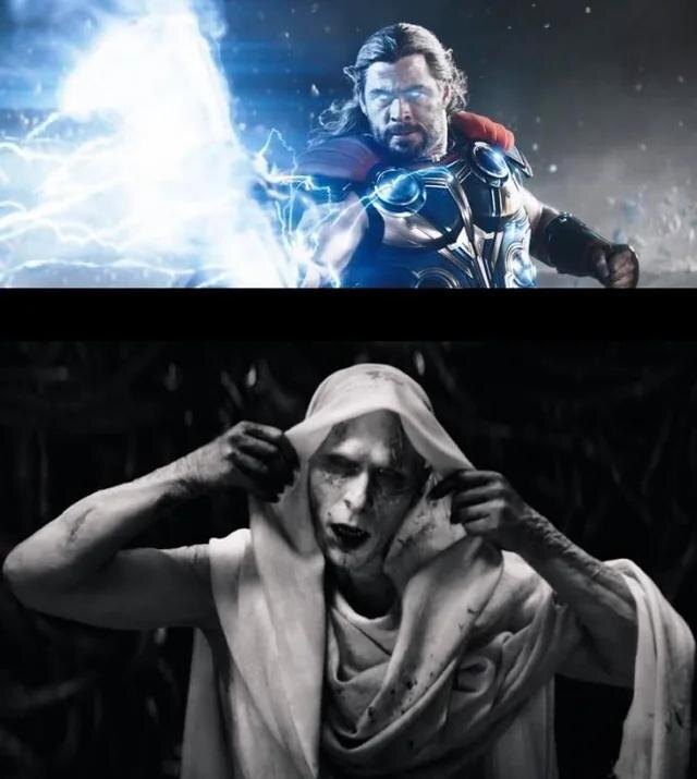 «Тор: Любовь и гром» — в основном хаотичный беспорядок, за исключением одной сцены, где Тайка Вайтити действительно показал класс Наконец-то посмотрел «Тор: Любовь и гром», и у меня ощущение, что фильму совсем немного не хватило до greatness. Все необходимые элементы на месте: Тор, который снова учится открываться после потерь, возвращение Джейн с историей о раке и Горр-убийца богов (которого играет не кто иной, как Кристиан Бейл) в роли главного злодея. Но юмор просто уничтожил этот фильм. Сцена, из которой я опубликовал кадры, — безусловно лучшая часть фильма, и всё потому, что в ней нет этого дурацкого юмора, который пронизывает остальное. Кристиан Бейл выдаёт потрясающую актёрскую игру, несмотря на ограниченное экранное время. Так хочется, чтобы Горр был злодеем в двух фильмах — у него явно был потенциал для этого.