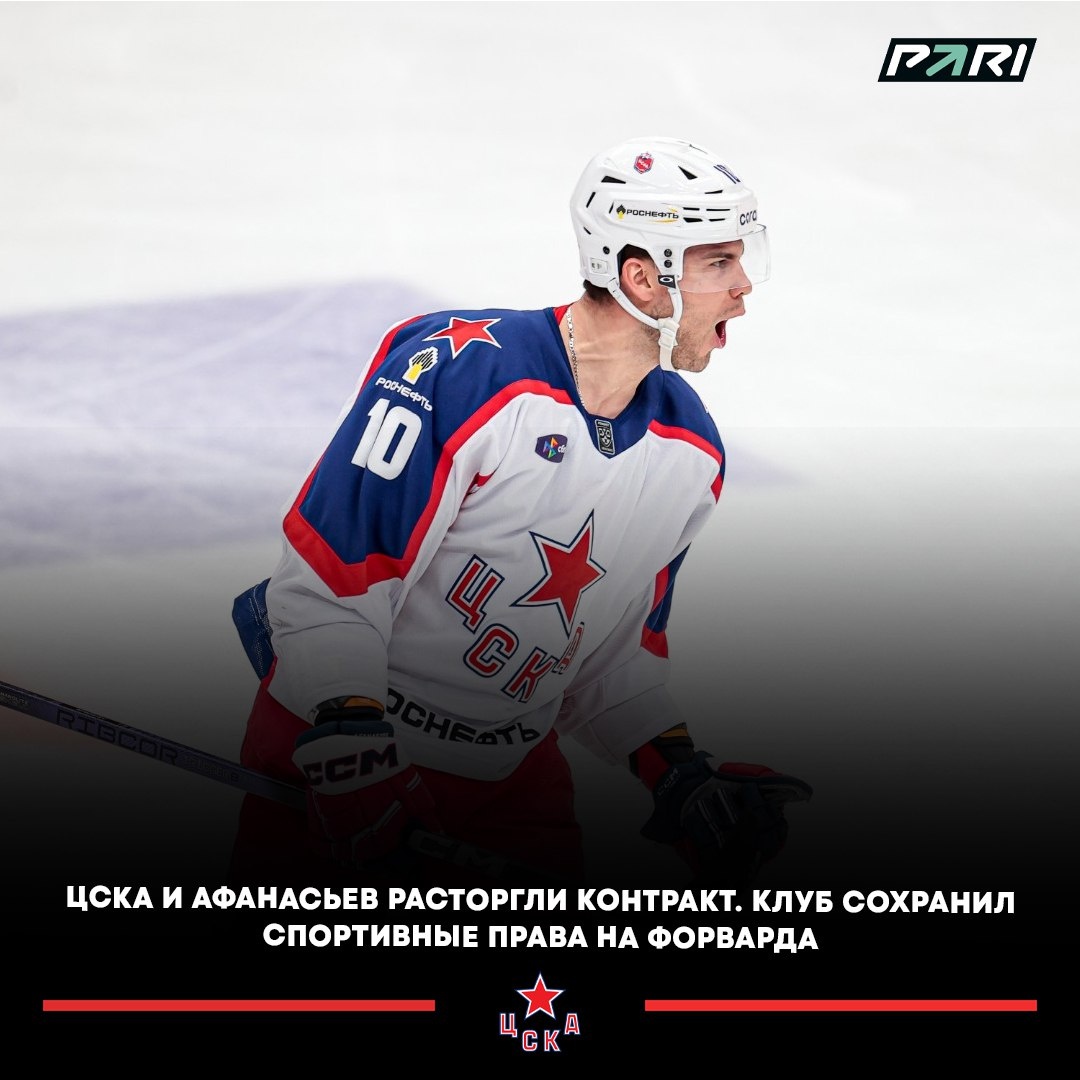 🔥🇷🇺 Егор Афанасьев покидает ЦСКА. 🤝 Клуб и нападающий достигли соглашения о прекращении действия контракта. Спортивные права на 24-летнего хоккеиста остаются за командой. 🚨 В регулярке Чемпионата КХЛ он провел 53 матча и набрал 21 (7+14) очко. В плей-офф-2025 в его активе 4 (2+2) балла в 6 играх.