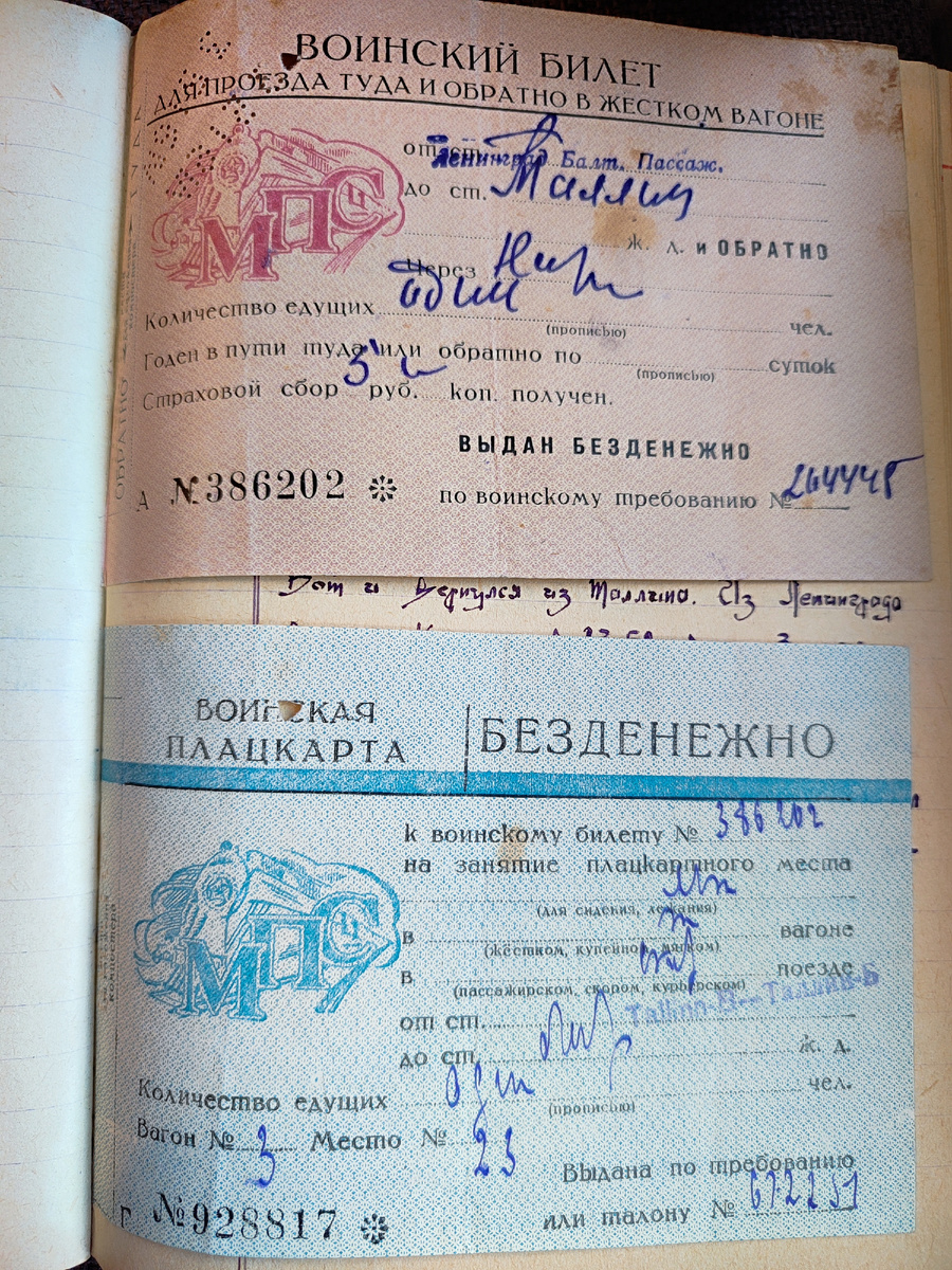 Ленинград Шёл дождь, температура 4°. Сутки не был дома. Вчера после политзанятий проводил прививки всему личному составу части. Сильная реакция как местная так и общая. Ночью приходилось два раза вставать. Сегодня ещё некоторые плохо себя чувствуют. Вчера отправил маме посылку, вес 7 кг 200 г - 17 руб. Сегодня заканчивал прививки. Даже себе сделал, А то с 1945 года боялся. Получил деньги 1.184 руб, а там опять меньше будем получать. Завтра еду в Лебяжье, видимо придётся ехать в Таллин в сан отдел флота, всё из-за аптечек для катеров. Ленинград Вчера был в Лебяжьем. Оформил документы и сегодня должен ехать. Полковник Беляев дал ещё свои личные поручения. В 21:00 на вокзал за билетом, а в 23:50 скорый отходит в Таллин. На улице сегодня тепло. Многие уже ходят без пальто. Сегодня продал соседу свой выходной костюм, что получил зимой, за 450 руб. Ленинград Вот вернулся из Таллина. Из Ленинграда выехал 16 апреля в 23:50. Цельнометаллический вагон, удобно и культурно. В 10:30 17 апреля б
