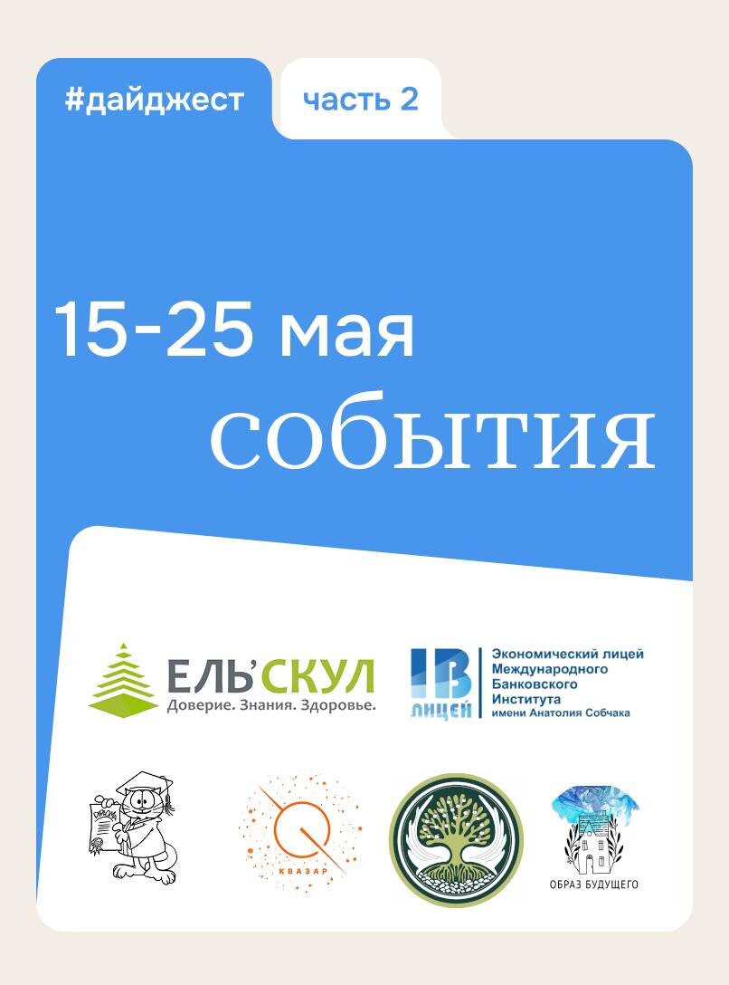 • 19-23 мая Интенсив: Обществознание ОГЭ в школе Стимул Онлайн https://vk.cc/cLENsB • 19 мая 19.30 День открытых дверей средней школы Стимул Онлайн https://vk.cc/cLENCi • 21 мая День открытых дверей для будущих лицеистов и их родителей в Экономическом лицее МБИ Центр https://vk.cc/cLENSr • 22 мая Приглашаем на экскурсию в здоровьесберегающее пространство ЕЛЬ’СКУЛ Приморский район https://vk.cc/cLEO5P • 24 мая 12.00 День открытых дверей в образовательном пространстве «Квазар» Московский район https://vk.cc/cLENCi • 24 мая 12.00 День открытых дверей в Центре поддержки семейного образования «Образ Будущего» Юкки https://vk.cc/cLENCi • 24 мая 14.00 День открытых дверей в РКШ Соль земли Московский район https://vk.cc/cLY8Hd Ещё больше событий на нашем сайте в Календаре событий.