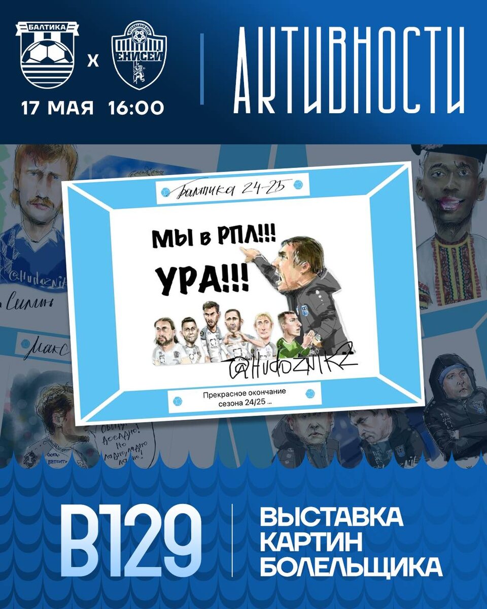 ИСКУССТВО НА «РОСТЕХ АРЕНЕ» ⚽️ Балтийцы, внимание! Мы продолжаем радовать вас специальными активностями к заключительному домашнему матчу сезона, и сегодня у нас для вас нечто особенное! 💙 То, чего вы точно ждали — выставка картин нашего дорогого Художника! Его работы давно вдохновляют в социальных сетях, а теперь вы сможете: 🖼 увидеть картины вживую, 🤝 пообщаться с автором лично, 📍 и всё это — на секторе В129! До встречи на «Ростех Арене», бело-синие!