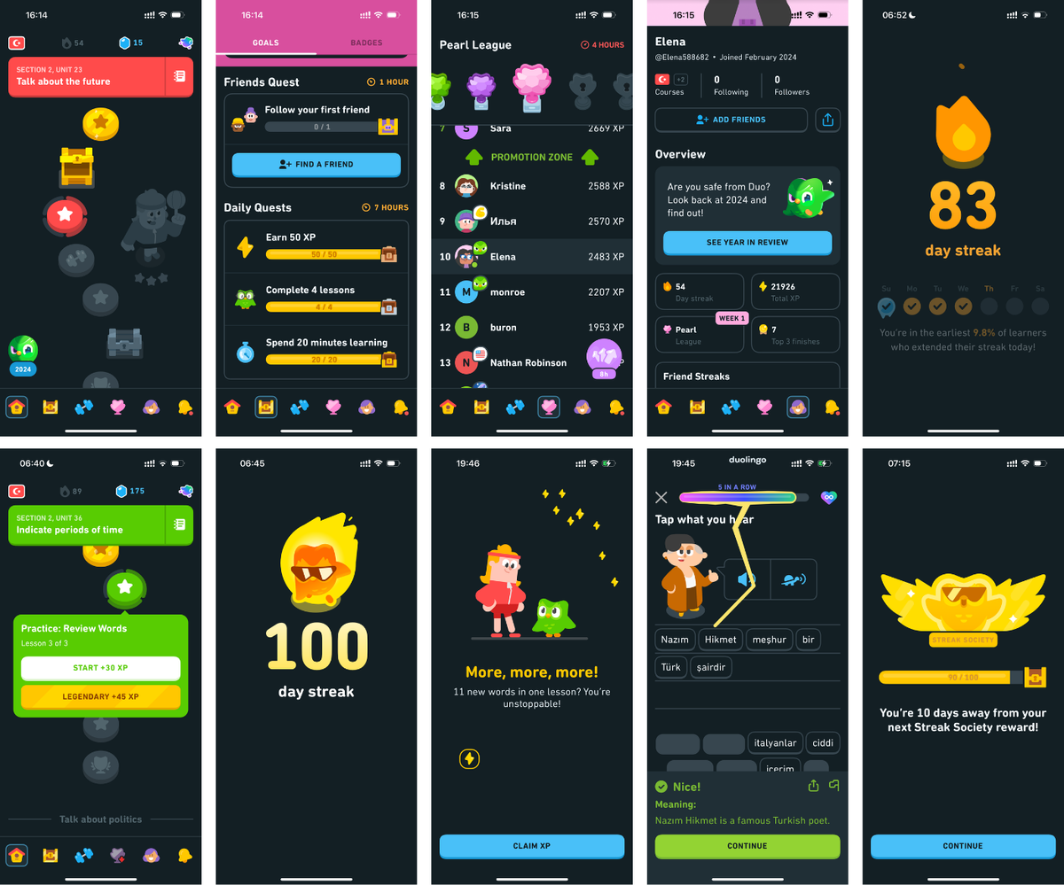 Препарируем геймификацию мобильного приложения #duolingo, которую я считаю примером успешной геймификации. Краткая справка по результатам компании и ее конкурентов за последние годы (беру только открытые данные). ▶️ Duolingo:2021: Доход составил $250,77 млн. 2022: Доход вырос до $369 млн (+47,34% к 2021 году). 2023: Доход достиг $531 млн (+43,74% к 2022 году). 2024: За последние 12 месяцев, закончившиеся 30 сентября 2024 года, доход составил $689 млн (+42,47% в годовом выражении). (Источник: macrotrends.net) ▶️ Rosetta Stone (до 2021 года была публичной): 2019: Доход составил $182,6 млн. 2020–2024: Точные данные о доходах отсутствуют, так как компания была приобретена. Babbel (готовилась к IPO, но осталась частной): 2021: Доход составил приблизительно €188 млн. 2022: Доход вырос до €247 млн (+31% к 2021 году). 2023–2024: Данные о доходах недоступны. (Источник: statista.com) Геймификация в Duolingo базируется на пяти основных элементах: мотивация, прогресс, обратная связь, социальные