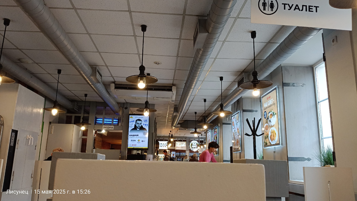 День у меня сегодня длинный. Три работы. Я никуда не тороплюсь. Работаю себе и работаю. Хочу все посмотреть,сколько пройду шагов за этот день. И вот я на финишной,еду на третью. Увидела Му-Му .Кафешка,столовая. Цены конечно не столовские. Всегда беру с собой что нибудь поесть. В обед все равно нужно проглотить что то . А тут как захотелось салата,витаминного или типа такого. А потом супчик овощной,хлебушек и чтоб ланч был, компот из сухофруктов. Вышло около 500. Ем и таращусь на рекламный экран. Скидка 20% с 8-12 и с16-23 по карте москвича пенсионерам,инвалидам и многодетным семьям. Я пришла между.Но теперь буду знать и заходить,если вдруг приспичит. Всем отличного продолжения дня!
