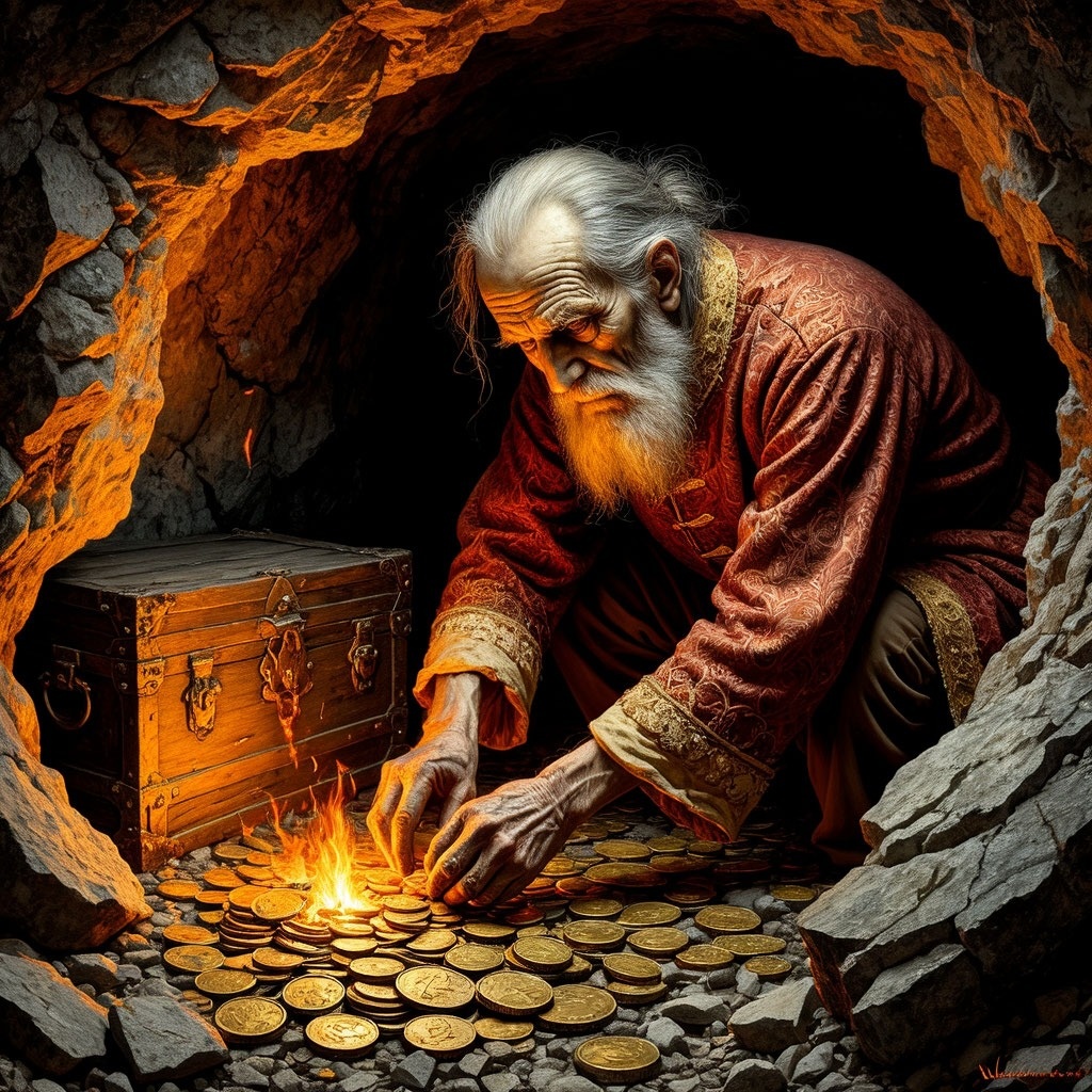 В городе, где даже воздух пах медью, жил купец Загребакин. Был он жаден до того, что воровал хлеб у голодных воробьёв, а у слепых старух вытряхивал последние гроши из кошельков. «Бедность – порок», - любил повторять он, завязывая свой кошель тремя узлами.