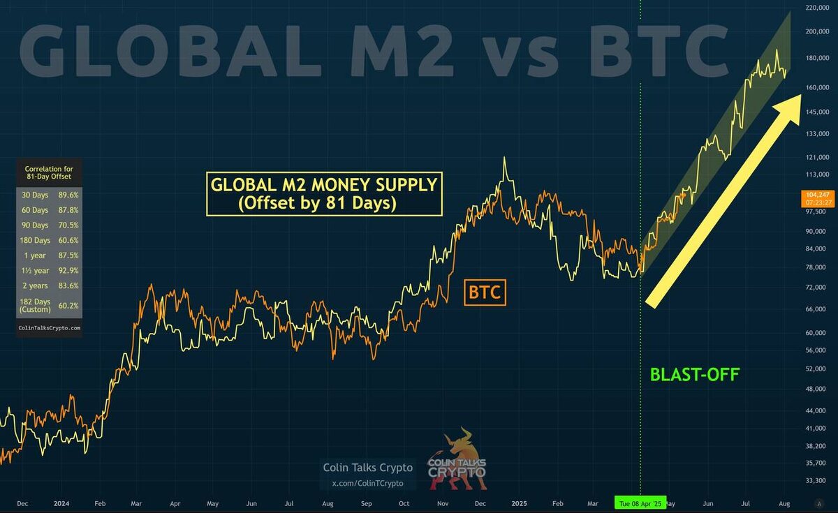 Синхронизация, которая работает? Пока часть рынка переживала затяжную коррекцию и гадала, «а не всё ли уже?», глобальная денежная масса (M2), сдвинутая на 81 день, спокойно указывала вверх. И угадайте, что случилось? Биткоин сделал ровно то, что рисовал M2: с $76k до $105k — аккуратно по траектории, без паники. И это не совпадение. Эта модель уже помогла избежать ошибки — не слить на страхе. Сейчас по модели у нас впереди участок “BLAST-OFF” — и если она продолжит работать, то $120,000+ уже к концу мая более чем реально. А дальше начинается самый сочный отрезок: FOMO, пробой исторического максимума, запрыгивания в последний вагон, говорящие головы на TikTok и CNBC. Всё по сценарию. Но запомните важное: Модель — это не гарантия. Это карта вероятностей. И эта карта уже один раз сыграла. Главное — не выбрасывать компас в момент временного расхождения. Что дальше? Хочу сделать ещё один разбор на эту тему: — почему глобальная ликвидность вообще влияет на BTC — почему корреляция мо