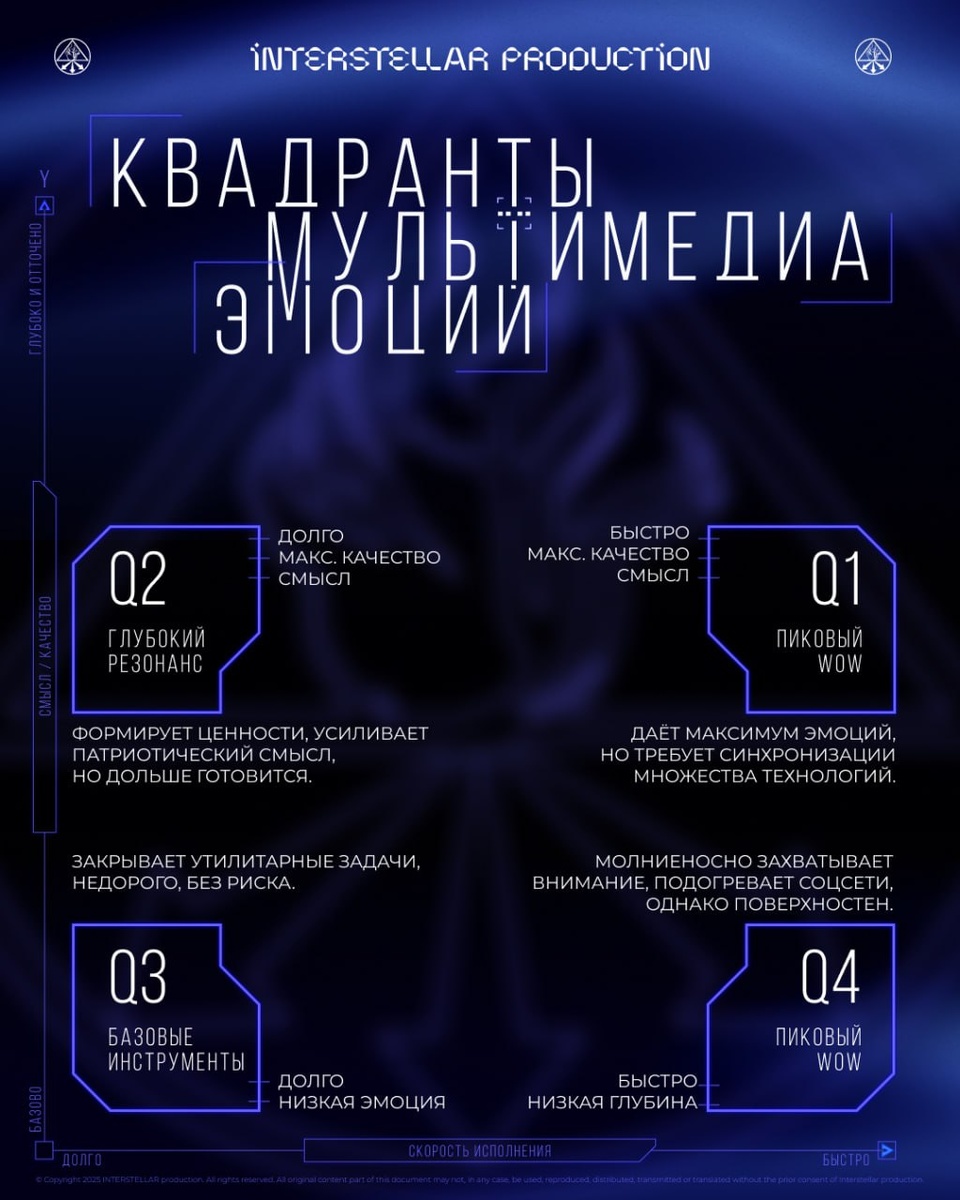 Собрали научную базу в матрицу мультимедиа эмоций ❗ Interstellar Production снова на вашей орбите! У нас на борту — UX-дизайнеры эмоций, инженеры смыслов и CG-маги, которые превращают сложные брифы в визуальный адреналин. Каждый проект — это битва. Где ставка — чувства зрителя. 🫶Нам важно не просто “сделать красиво” — мы охотимся за резонансом, который застрянет в памяти и проберёт до мурашек. Но вот в чём проблема: У клиентов — передоз вариантов! AR, VR, интерактив, LED, 3D-мэппинг, голограммы, видеопорталы, лазеры, видеоарт, генератив... Что из этого реально работает? А что просто "блестит, но не цепляет"? Чтобы вас не унесло течением хайповых технологий, мы собрали шпаргалку по мультимедиа-эмоциям: ✨ По горизонтали: время реализации. От проектов-слонов (медленных, но могучих) до быстрой визуальной артиллерии. От "под ключ за завтра" до "это будет бомба, но через полгода". ✨ По вертикали: эмоциональный импакт, сила смысла и эмоциональный удар: от нейтральных «ага, прикольно» до