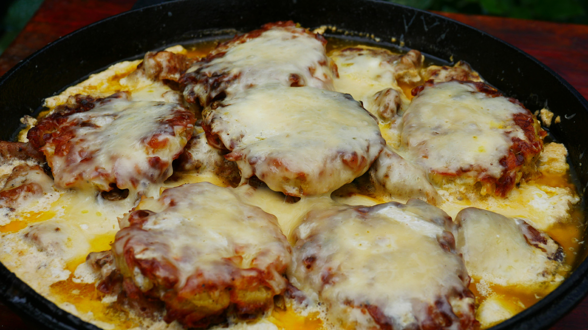 Картофельные драники, во всем бывшем Советском Союзе, знали и любили это блюда, правда название выбирали разные, а технология приготовления была одна, и сейчас как вспомним как нам готовили бабушки, мамы, стараемся воспроизвести, не всегда так вкусно получается, но готовим. Мой рецепт картофельных драников будет, более изысканным, с добавлением, жареного мяса, грибов, сыра. Начнем готовить. Свиная вырезка, как вкусная и сытная добавка к драникам, нарезаем на крупные куски. Свежие опята, еще один ингредиент в наш букет вкусов к драникам, опята мелкие моем и на сухую сковороду, пусть водичка с них выйдет. К опятам в сковороду добавим добавим топленое сливочное масло, нарезку двух луковиц, и свиную вырезку, обжариваем жареху до готовности, в конце добавим соль, черный перец, было желание сразу скушать, настолько ароматна, и аппетитна, еда в сковороде, но вытерпел. Дальше привычная процедура в приготовлении драников, терка, очищенные клубни картофеля, делаем картофельное тесто. В натертую