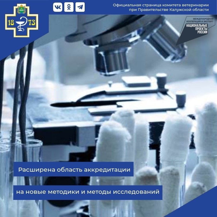 Госветслужба Калужской области планирует принять участие в национальном проекте «Экспорт продукции АПК» и расширить области аккредитации испытательных лабораторий в национальной системе аккредитации во втором полугодии 2025 года. Напомним, на территории Калужской области расположены 8 аккредитованных ветеринарных испытательных лабораторий, принимающих участие в нацпроекте «Экспорт продукции АПК» с 2022 года. Благодаря участию в нацпроекте, лаборатории обновили основные фонды лабораторий, вивариев; приобрели современное цифровое лабораторное оборудование и усовершенствовали методы лабораторных испытаний, повысили уровень квалификации специалистов. В 2025 году 6 испытательных лабораторий (Областная, Жуковская, Кировская, Малоярославецкая, Сухиничская и Ферзиковская) планируют принять участие в национальном проекте. При положительном решении, госветслужба области готова завершить его к концу сентября 2025 года, выполнив все показатели на 100%. #Тема_дня_Планы_2025