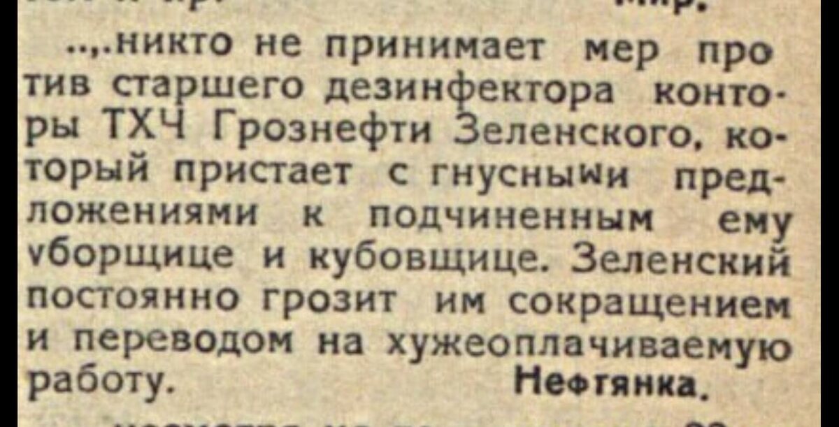 ПОЧЕМУ... ....никто не принимает мер против старшего дезинфектора конторы ТХЧ Грознефти Зеленского, который пристает с гнусными предложениями к подчиненным ему уборщице и кубовщице. Зеленский постоянно грозит им сокращением и переводом на хужеоплачиваемую работу. Нефтянка. #АрхивТуапсинскихВестей №28 26 апреля 1930