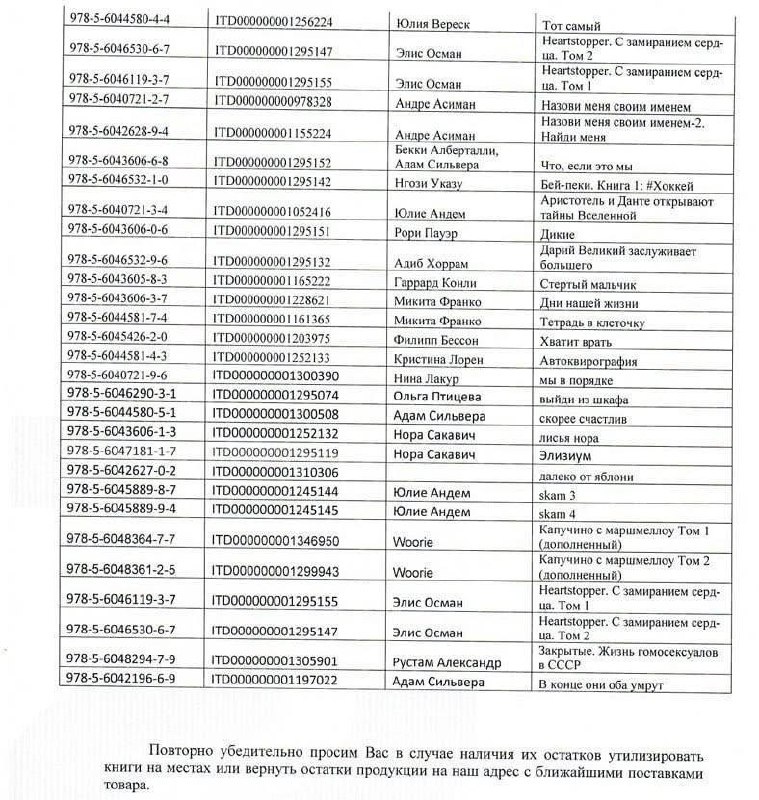 «Эксмо» попросило книжные магазины уничтожить тиражи десятков книг Издательство «Эксмо» после задержания топ-менеджера и других сотрудников разослало книжным магазинам письмо с требованием утилизировать или вернуть тиражи 48 книг издательств Popcorn Books и Individuum. Среди книг есть «Лето в пионерском галстуке» и «Элизиум» от Popcorn Books, а также «Закрытые. Жизнь гомосексуалов в СССР» Рустама Александера (Individuum). Остальные экземпляры из списка также связаны с ЛГБТ* (например, первая и вторая части «Назови меня своим именем»). * Международное движение ЛГБТ признано экстремистским и запрещено в России. https://bg.ru/bg/business/comm-news/27280-books-eksmo ❤️ «Большой Город»