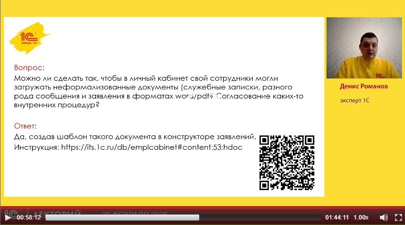 ❓Можно ли сделать так, чтобы в личный кабинет свой сотрудники могли загружать неформализованные документы (служебные записки, разного рода сообщения и заявления в форматах word/pdf? Согласование каких-то внутренних процедур? на этот и другие вопросы ответил Денис Романов, эксперт 1С в лекции на тему Демонстрация возможностей кадрового электронного документооборота от 1С 👇Смотрите видеозапись лекции бесплатно!👇 На Rutube Вконтакте На сайте 1С:ИТС 🚨Подписывайтесь на @lector_1c