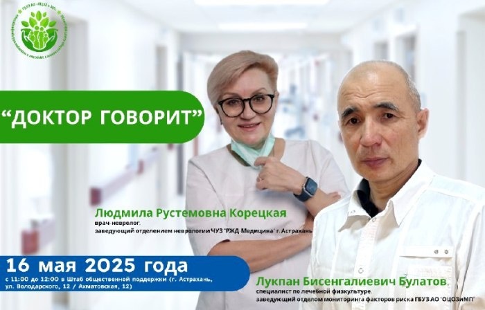Сердечно-сосудистые заболевания — одна из главных причин преждевременной смертности в нашей стране. Как предупредить развитие болезней, сохранить здоровье и энергию на долгие годы? Приходите завтра, 16 мая, с 11:00 до 12:00 в Штаб общественной поддержки в Астрахани (ул. Володарского, 12/ул. Ахматовская, 12) на встречу в рамках проекта «Доктор говорит». Вас ждут: • Людмила Корецкая - врач-невролог, заведующий отделением неврологии. Она расскажет о хронической ишемии головного мозга и её последствиях; • Лукпан Булатов, специалист по лечебной физкультуре, заведующий отделом мониторинга факторов риска. Он объяснит, как физическая активность помогает сохранить молодость и здоровье. Также вы сможете: • пройти экспресс-обследование на «точке здоровья»: измерить давление, уровень кислорода и глюкозы в крови, мышечную силу, рассчитать ИМТ; • получить консультацию врача-эндокринолога; • задать свои вопросы специалистам, в том числе и самые наболевшие. Не упустите возможность позаботиться о себе