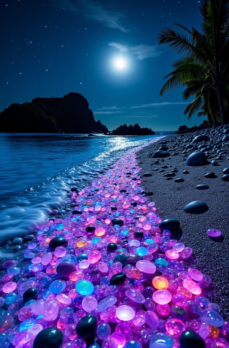 Берег, усыпанный неоновыми камушками в свете луны. Нейросеть: Leonardo. Preset: Flux. #цифроваяживопись #нейросеть #нейроSD #море #нейроарт #арт #идеи #цифровоефото #рисунок #нейрофото #артыотнейросетей #DigitalDreamscapes #пейзаж #digitalart #leonardo #aiartwork #flux #иллюстрация #природа #камни #берег #луна #ai