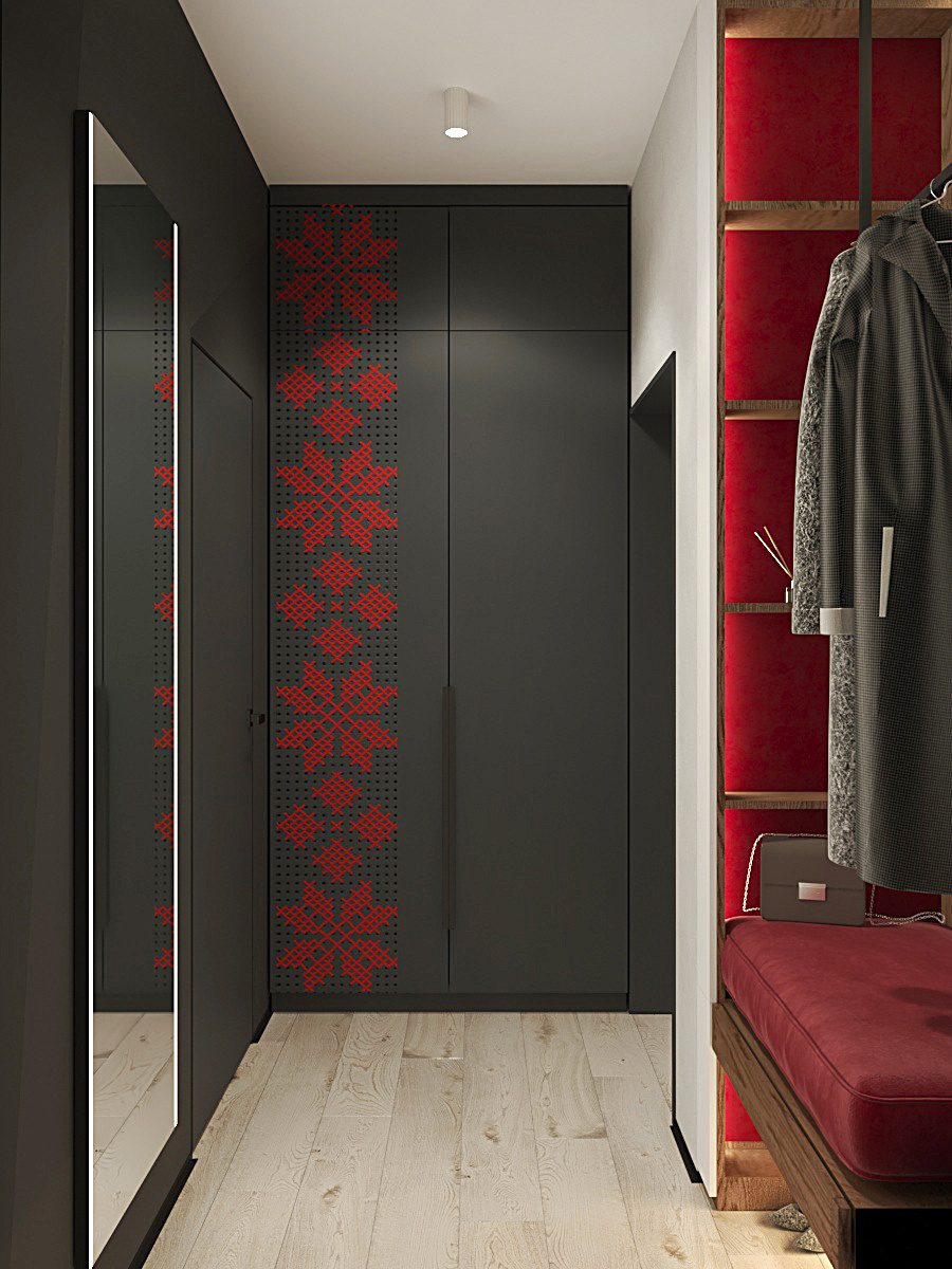 Средний бюджет, но при этом она все-таки объект в Санкт-Петербурге – северной столице, к тому же еще и культурной. И концепция интерьера была с учетом этого факта. Пришлось использовать смекалку и креативность: решено было добавить изюминки и сделать не просто строго и лаконично, как хотел клиент, но и концептуально, добавив «русскости» в интерьер. Совсем чуть-чуть. Уже на пороге нас встречает первая изюминка. Вышивка крестом на стене – это перфорация на фанере. В эти отверстия будет продета красная нить. Долго работали на планировкой. Квартира небольшая. Гостиная – с кухней. И наш дизайнер Марина справилась с задачей, разработав действительно функциональную планировку. Она предложила остров с функцией стола и кухонных шкафов, который зонирует кухонную часть от самой гостиной. На стене за диваном клиенту предложили сделать узор – имитация состаренной штукат