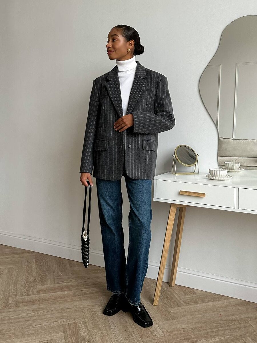 Сочетание классического пиджака с мужского плеча, лаконичной белой водолазки и расслабленных джинсов - баланс строгости и комфорта
