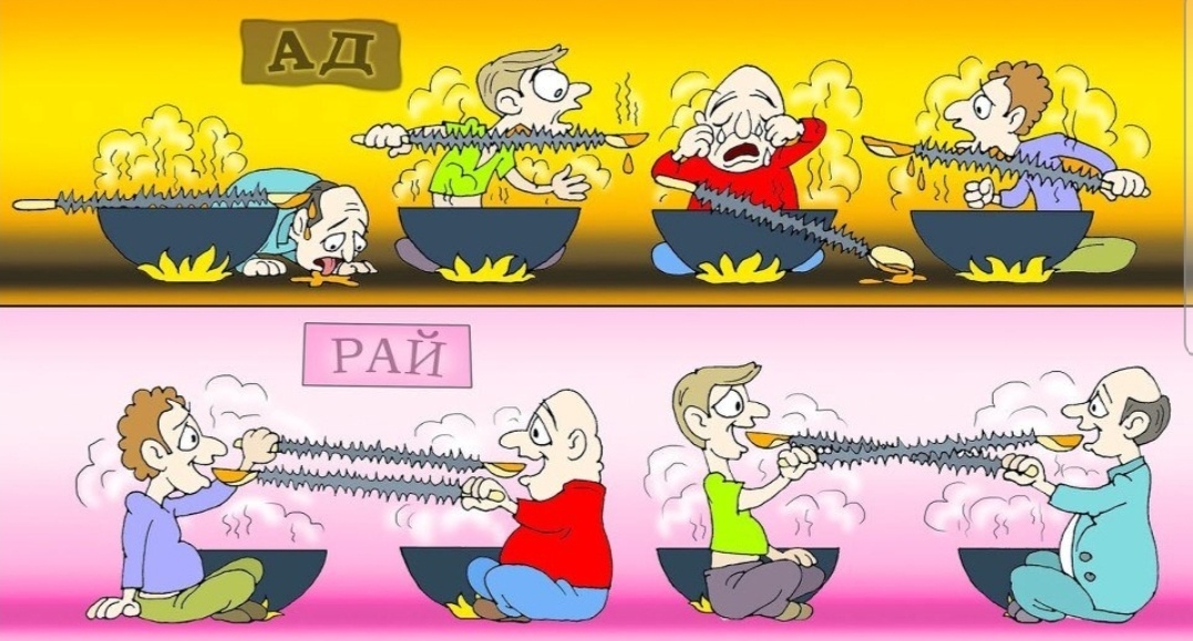 Притча. Однажды святой человек имел возможность разговаривать с Богом и попросил его: – Господи, для меня было бы счастьем увидеть как выглядят ад и Рай. Бог подвёл его к двум дверям. Открыл одну дверь и позволил ему заглянуть внутрь. Посредине комнаты стоял большой круглый стол. На столе находилась большая миска с едой великолепного вида и приятного запаха. Сидевшие за столом люди были очень худые, посиневшие и выглядели болезненно. Каждый имел ложку, приклеенную к руке, но с очень длинной ручкой. Каждый мог дотянуться до миски и зачерпнуть еду, но не мог взять в рот, так как ложка была длиннее руки. Святой вздрогнул от одного вида этих людей и их страданий. – Вот ты и видел ад, – сказал Бог и открыл другую дверь. Сцена, которую увидел Святой, была аналогична предыдущей. Был тот же большой круглый стол и миска полная прекрасной еды. Люди за столом имели те же длинные ложки, прикреплённые к рукам. Но все они выглядели сытыми и счастливыми и, улыбаясь, мило беседовали. Святой че