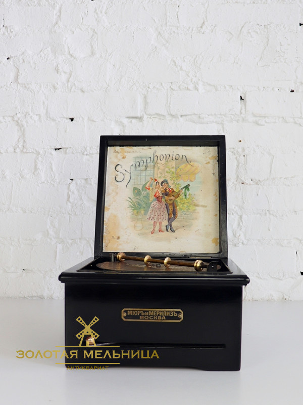 Старинная музыкальная шкатулка с записью на вращающихся жестяных дисках - полифон. Шкатулка изготовлена в 1895 - 1900 годах в Германии под торговой маркой Симфонион (Symphonion) специально для Московского торгового дома Мюръ и Мерлизъ (после национализации магазин стал известен как ЦУМ, Центральный Универмаг Москвы)