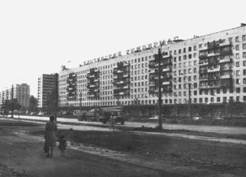 Проспект Славы. Купчинский универмаг. 1988 г. *** В конце 1960-х годов в микрорайоне Купчино открылась сеть магазинов, расположенных в отстроенных «девятиэтажках». В мае 1973 года на базе этих магазинов по решению исполкома Ленгорсовета был образован новый современный универмаг.