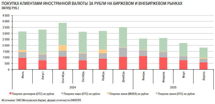 Суммарные покупки валюты клиентами банков в апреле достигли минимума с момента прекращения части валютных торгов на Московской Бирже, сообщает Банк России в «Обзоре рисков финансовых рынков». Источник: Банк России Апрельское укрепление рубля против доллара США и китайского юаня было по-прежнему обусловлено соотношением спроса и предложения на иностранную валюту, сообщает Банк России в «Обзоре рисков финансовых рынков». «Суммарные покупки валюты клиентами банков в апреле достигли минимума с момента прекращения части валютных торгов на Московской Бирже. В апреле на покупку иностранной валюты на внутреннем рынке было направлено 1,8 трлн рублей. Для сравнения: в I квартале 2025 г. этот среднемесячный показатель составил 2,5 трлн руб.», — говорится в документе. В апреле — на фоне дорогого рубля — физлица продолжали покупать валюту на биржевом и внебиржевом рынках, приобретя ее на чистые 68,5 млрд руб., отмечает регулятор. Тем не менее данный показатель не только снизился с мартовских 88,2 м