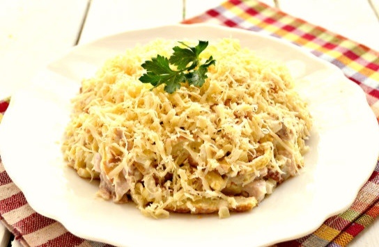 Филе куриное - 300 г Яйца - 5 шт. Сыр твердых сортов - 80 г Лук репчатый - 2 шт. Майонез - 4 ст. ложки Соль - по вкусу Масло растительное - 3 ст. ложки Яйца взбиваем и жарим блин. Далее режем его на полоски. Сыр натираем на тёрке Филе куриное отвариваем. Мелко нарезаем. Лук нарезаем мелко Всё смешиваем с майонезом. По желанию добавить чеснок.