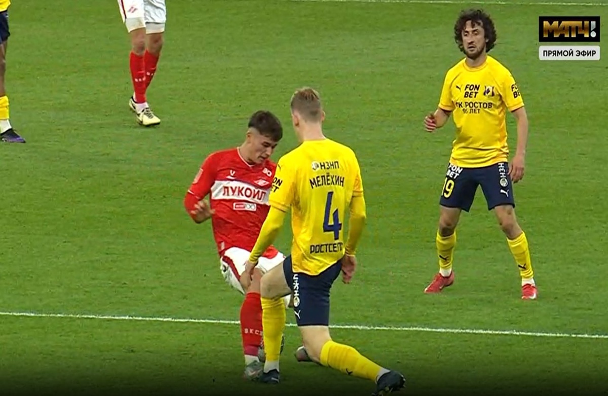 Правильное решение принимает Левников и показывает 2-ю ж.к игроку №9 команды Спартак (грубая игра)