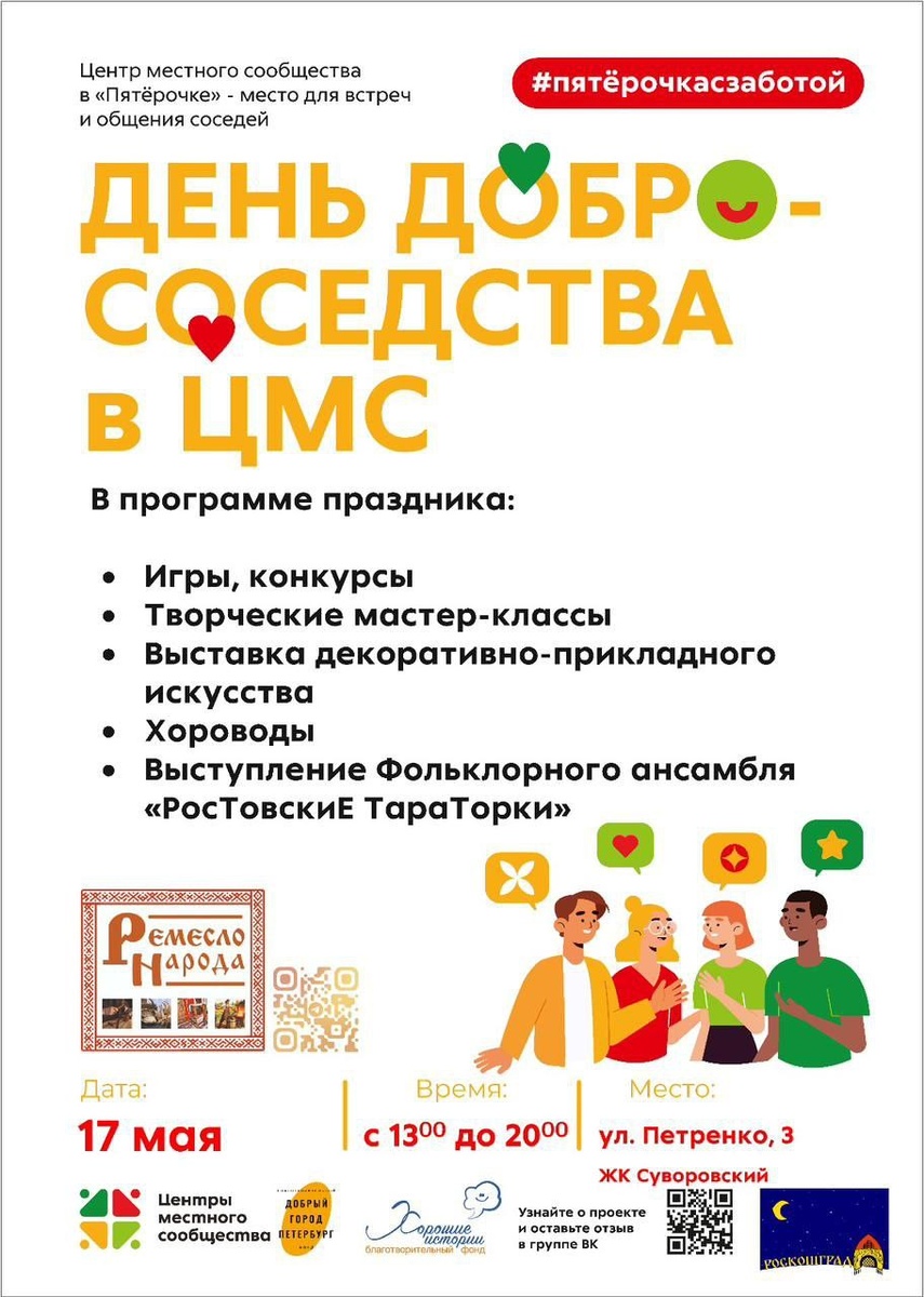 День Добрососедства 17 мая (сб) с 13⁰⁰ до 20⁰⁰ В программе праздника: Игры, конкурсы Ремесленная выставка-ярмарка Творческие мастер-классы Хороводы Выступление фольклорного ансамбля «РосТовскиЕ ТараТорки» ТЦ Суворовский Ул. Петренко, 3 Около магазина «Пятёрочка» Ростовчане! Ждём в гости!