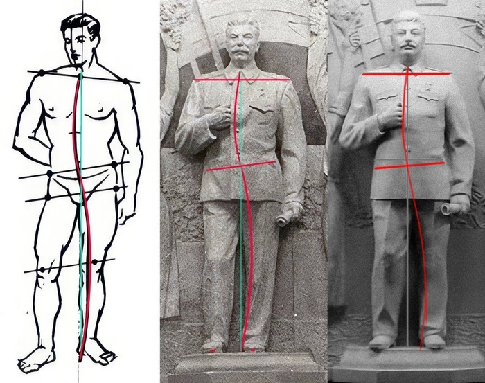 Возможно, «историку алкоголику», всё же, стоит завязать с алкоголем. Ибо докопался буквально на ровном месте. В обоих горельефах, новом и старом, поза не соответствует приведённой. Сталин не просаживается в бедро, а стоит стройно с правой ногой слегка впереди. По линии плеч больше всего заметно различие: на обоих горельефах она горизонтальна. Линия таза произвольно нарисована, ибо она не угадывается под кителем. Он тут почти горизонтальным должен быть. Это не настолько расслабленная поза. Ну а вертикальная осевая линия в исходом посте - явное натягивание совы на глобус при том, что левая нога прямо слегка отведена назад, а правая делает небольшой шаг и согнута в колене. В общем, новый горельеф слегка в другом стиле с меньшим акцентом на мелких деталях. Хуже это или лучше - дело вкуса. Но натягивать сову на глобус и врать про постуру не надо. Пост автора buhanka.chan. Читать комментарии на Пикабу.