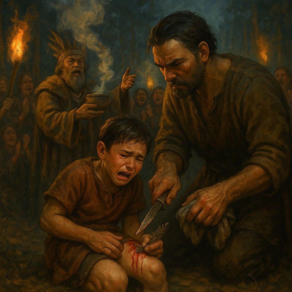 – Ай! – еле слышно прошипел мальчик. – Терпи, сынок, – так же тихо сказал отец, услышав стон сына. В руке он держал большой, заострённый как бритва нож, – терпи. Из глубокой свежей раны на бедре мальчика ручейком заструилась кровь. – Наконец ещё одно дитя обретает силу! – вождь громко вещал с небольшого деревянного подиума. В руке он держал глиняную мисочку, в которой едва дымился особый травяной сбор. В перерывах между фразами вождь хорошенько прикладывался к ней, набирая полные лёгкие забористого дыма, – Ещё один член нашей общины стал мужчиной! – небольшая толпа громко зааплодировала. Рана на бедре мальчика сильно горела, отец больно надавил на неё, смазав тряпкой, пропитанной соляным раствором, – Отныне, дитя, ты воин! Боец! – вождь приложился к миске, – Ты защищаешь нашу общину своей плотью и это, – мужчина указал пальцем на рану. Отец вновь надавил на неё, кровь с новой силой заструилась, – твоя метка. Знак! Знак того, что ты отмечен самим Богом! Толпа завыла в экстазе. Вождь спр