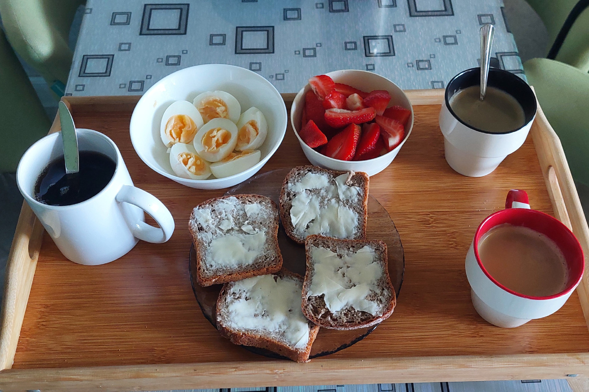 Утром встала бодра и весела. Странно 😁 Какое-то ощущение праздника было. На завтрак сварила кофе, яйца, намазала маслом ржаной хлеб и порезала клубнику - крупную в этот раз привезли. Днём всю мою праздничность и бодрость прибили школьные чаты 🤦🏼♀️ когда всё это закончится? Пока вздыхала заметила в кабинете, что у нас зацвёл цветочек. Как его зовут не знаю. Листья нежные, цветочки малюсенькие. Дома на ужин была картофельная запеканка, ржаной хлеб, огурчики и квашеная капуста. И апельсиновый сок. На вечерний перекус кофе и кекс. Вечерняя тренировка 🦾 После работы в цветочном купила розу 🌹 Попросила упаковать во что-нибудь, чтобы в автобусе до дома её довезти. Упаковали в упаковочную 🥰 Всё на фото. Так вот про чаты... Завтра последний звонок 🎈🔔 Вход в школу по спискам и паспортам. Не больше одного родителя на ребёнка, т.к. посадочных мест на всех родителей не хватает. Выпускается четыре 9 класса. Обалденно. Зачем вы тогда нас звали? Потому что мы денег сдали на подарки и цветы?