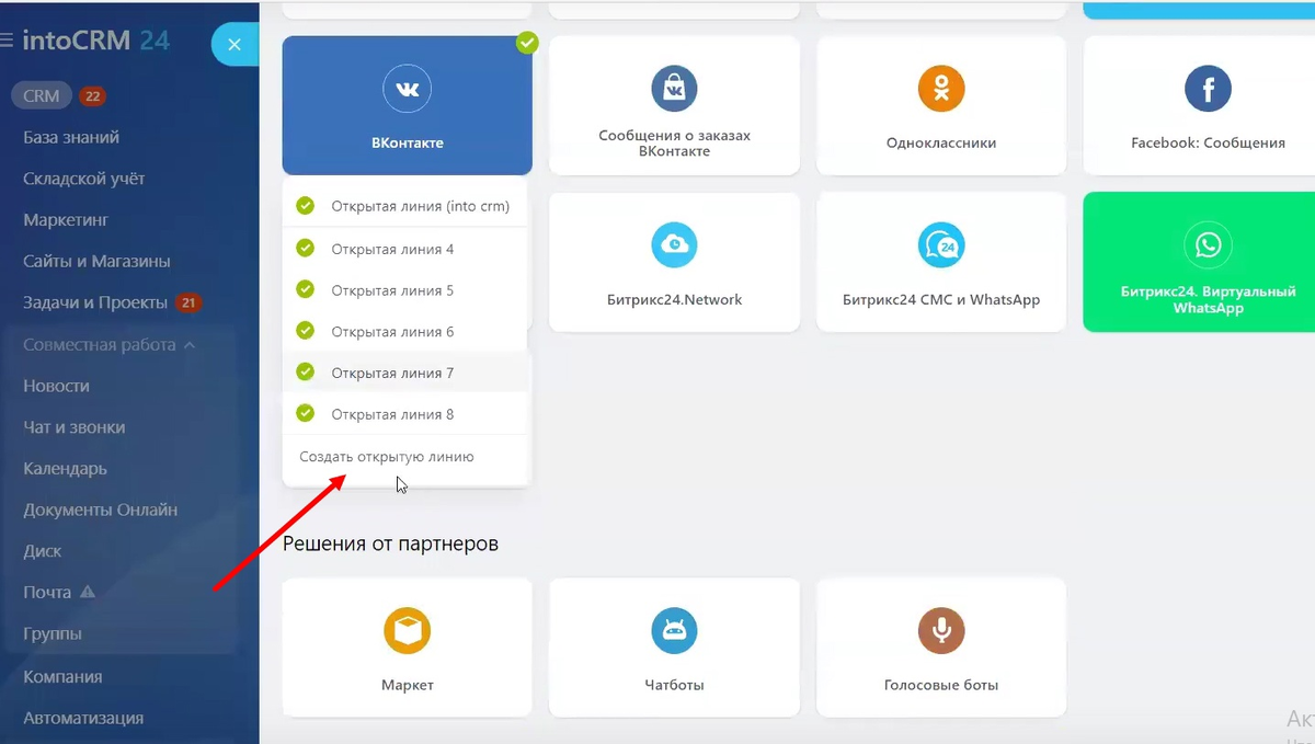Первый шаг – это подключение вашей группы ВКонтакте к Битрикс24. Для этого необходимо создать открытую линию, которая будет служить каналом для сбора обращений из ВК.
