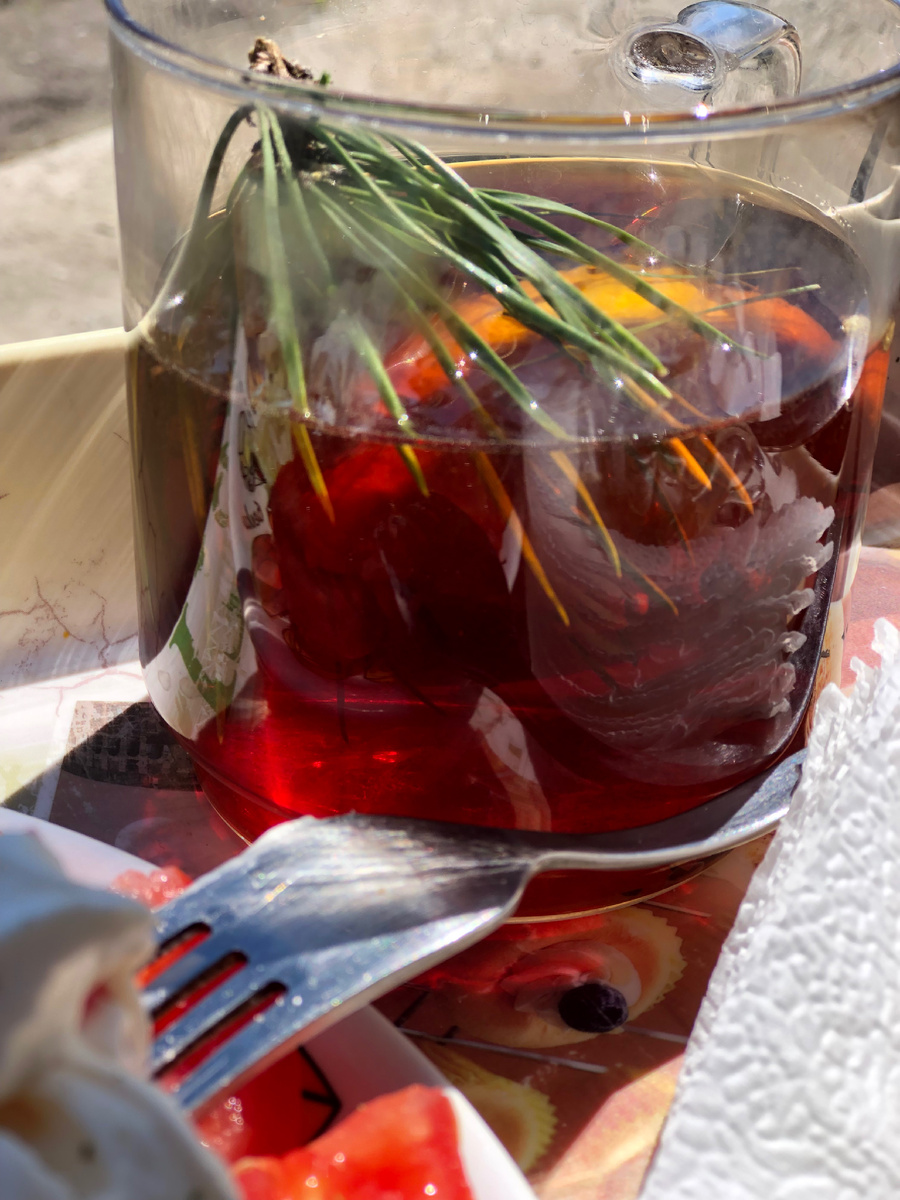 Если живешь за городом, то надо пользоваться всеми ништяками. Зачем обедать в доме, когда можно делать это на свежем воздухе? Вот так, например. Еда - самая что ни на есть обычная. В чем же ее "изюминка"? А вот в чем. Чай - из сосновых побегов и хвои. Мед - наш, Алтайский, с сосновой пыльцой. Только что собранной. Яйцо - утиное. Курятина-домашняя. Хлеб - морковный, из местной пекарни. Во рту тает, воздушный, пористый, с хрустящей корочкой. Сметана - тоже деревенская, покупаем у местных молочников. Капустный салат обычный, с оливковым маслом, ничего интересного. Вот это - оттенки природы! Всем приятного аппетита! Ням-ням!