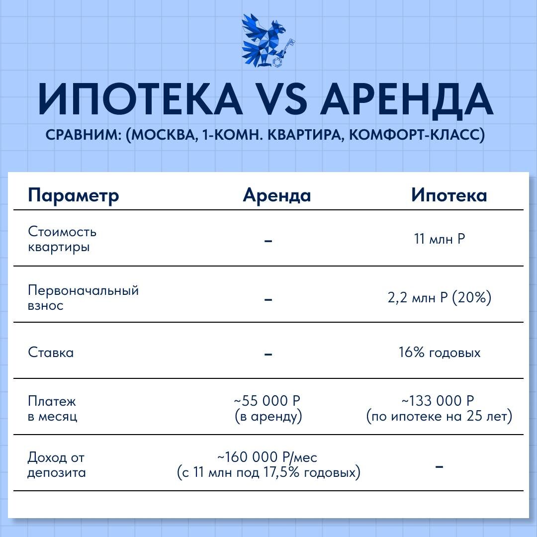 📌 Аренда vs ипотека — что выбрать в 2025? На первый взгляд аренда сегодня выглядит разумнее. Особенно если: ▪️ У вас есть капитал, который можно разместить под высокие проценты; ▪️ Вы не готовы к долгосрочным обязательствам; ▪️ Ипотека пугает ставками от 16% годовых; Но давайте на цифрах. 💰 Сравним на примере 1-комнатной квартиры в Москве, комфорт-класс — смотрите инфографику к посту. ☝🏻 💡 Вывод на сегодня: Если у вас есть капитал в 11 млн ₽ — выгоднее сдать его в банк под 17%+ и арендовать жильё. Ипотека же «съедает» почти в 2,5 раза больше в месяц и формирует актив, но в долгую. ⏳ Но что будет дальше? Ставки по вкладам начнут снижаться. Уже в 2025–2026 ЦБ может смягчить политику. 👉 Доходность по депозитам упадёт; 👉 А ипотечные ставки станут более приемлемыми; 👉 Рынок недвижимости начнёт новый виток роста. 🧭 Сейчас отличное время, чтобы готовиться к покупке: ▪️ Найти надёжного застройщика; ▪️ Смотреть на программы господдержки; ▪️ Подбирать объект под цели: для себя или