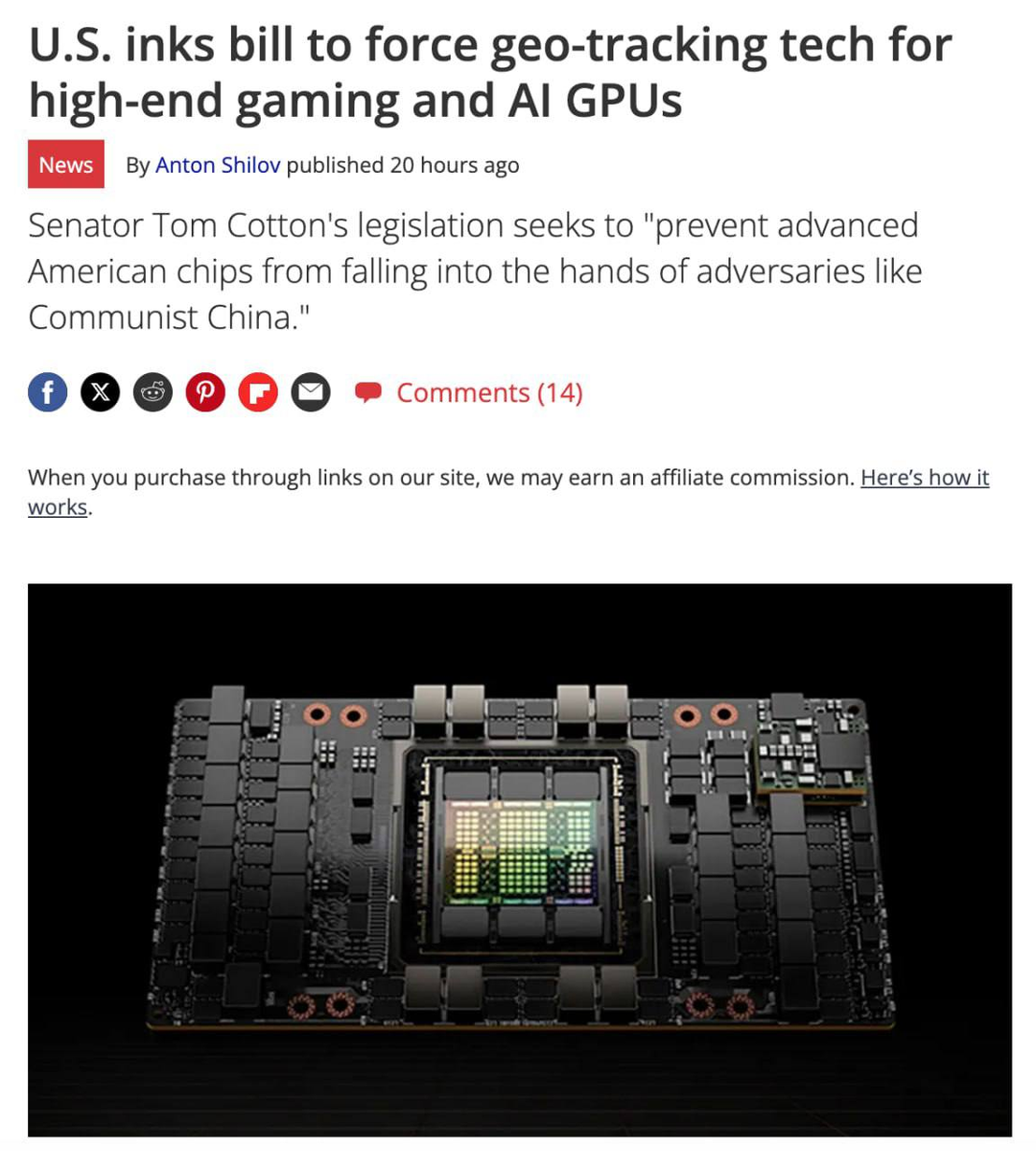 Согласно новому законопроекту, все GPU от Nvidia, AMD и Intel будут обязаны "знать", где они находятся — и отключаться, если попали не туда. Американские власти хотят, чтобы все произведённые в США или с американскими технологиями видеокарты были: Иными словами: купил RTX — увёз за границу — и она превратилась в тыкву. Главная цель — тормознуть развитие ИИ в Китае, где активно скупают топовые чипы для тренировки нейросетей.