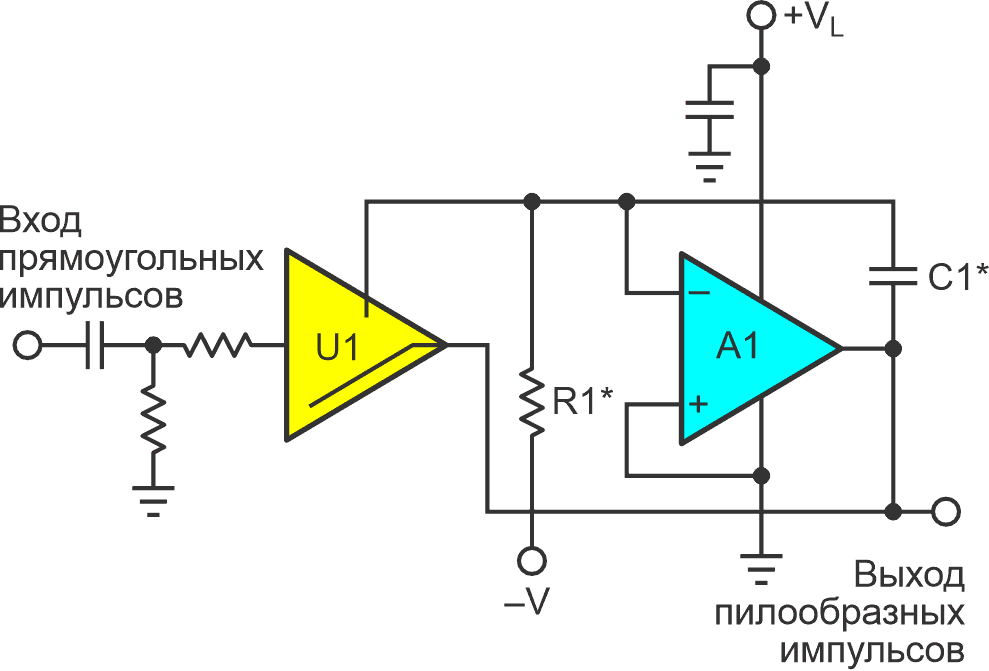 Генерация аналоговых пилообразных сигналов (линейное нарастание с последующим быстрым сбросом в ноль) из цифровых времязадающих импульсов является распространенной функцией. Обычно для этого требуется источник отрицательного напряжения, как показано на Рисунке 1, где (Здесь VSAW – амплитуда пилообразных импульсов, TSQ – период прямоугольных импульсов). Эта топология проста и хорошо работает, но ее недостатком является необходимость в отдельной отрицательной шине питания для возможности привязки интегратора к земле. Кроме того, RC-цепочка перед коммутатором U1, которая должна дифференцировать положительные фронты прямоугольных импульсов, довольно несимпатична и неточна. Читать далее здесь (оригинал статьи) https://www.rlocman.ru/shem/schematics.html?di=677571