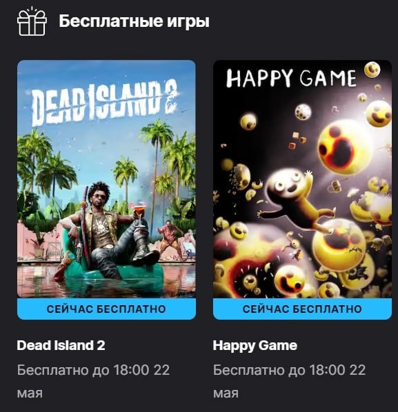 ⬛️ СПИСОК БЕСПЛАТНЫХ ИГР В EPIC GAMES STORE ОБНОВЛЁН! — Сегодня вы можете забрать следующие игры: • Dead Island 2 (до 22 мая 18:00 по мск); • Happy Game (до 22 мая 18:00 по мск). Для получения нужен аккаунт с любым регионом кроме РФ. ❤️Код автора: ZONAFN #AD ✈️ Зона Фортнайт • Наш чат 💬
