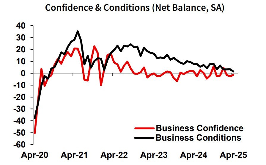 https://basechop.ru/wordpress/?p=42836 Ежемесячный бизнес-отчет NAB показал, что позитивный импульс, который привел к росту ВВП на 1.3% г/г в 1 квартале, сходит на нет. Деловая уверенность немного улучшилась, но продолжает оставаться на отрицательной территории и ниже своего долгосрочного среднего значения. Отмечено резкое снижение капитальных вложений (до самого низкого значения с июня 2024 года), снижение прибыльности и более мягкие форвардные заказы. Резкий рост загрузки мощностей, зафиксированный в марте, также был обращен вспять; этот показатель упал до 81,4% и теперь впервые с середины 2021 года вернулся к долгосрочным средним уровням. Хотя рост затрат на рабочую силу в этом месяце был стабильным, наблюдался рост затрат на закупку, а также более высокий рост цен на конечную продукцию и рост розничных цен. Добавим, что рост потребительских расходов в апреле замедлился до 0,1% после устойчивого роста в предыдущие месяцы. Поступающие данные сами по себе не могут изменить позицию…