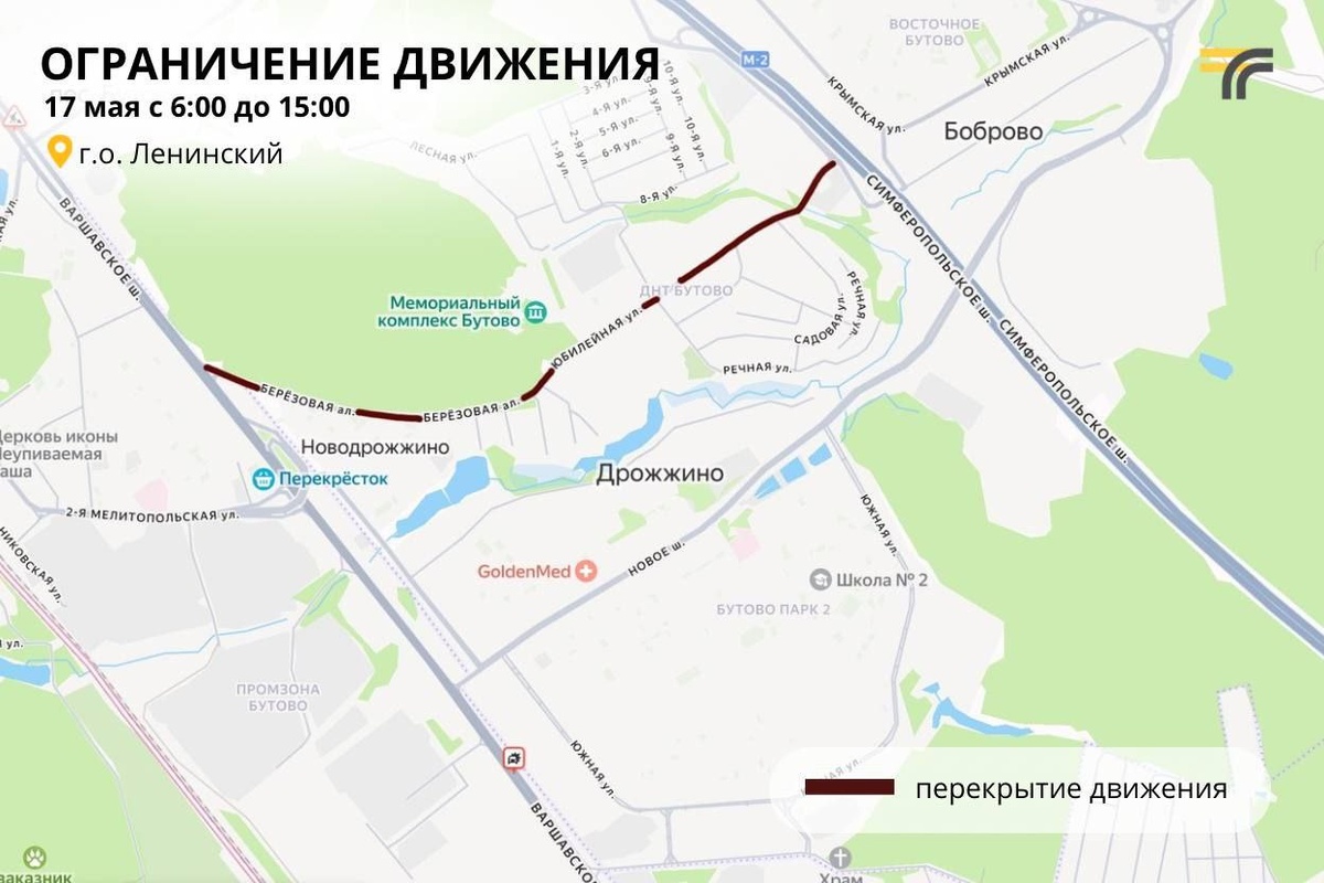 17 мая на территории Бутовского полигона в Ленинском округе пройдёт традиционное Патриаршее Богослужение. Как будет организовано движение транспорта: 🚘 для личного транспорта с 6:00 до 15:00 на Берёзовой аллее (от Варшавского шоссе до М-2 "Крым") движение будет закрыто 🚍 автобусные маршруты будут работать в штатном режиме В дополнение к маршруту №18 г. Москвы будет работать экспресс-маршрут №18э от метро Бульвар Дмитрия Донского до Бутовского полигона. Будьте внимательны! Учитывайте временные ограничения при планировании поездок. Минтранс Подмосковья 🚘 🚀🗯Подпишись на Telegram канал Дрожжино