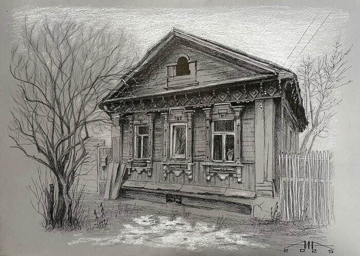 На картине изображен старый деревянный дом, расположенный на окраине города Ногинска. Дом выполнен в традиционном стиле русского деревянного зодчества. Фасад здания украшен резными элементами в виде ромбов, что придает ему особую выразительность и уникальность. Наличники окон строгие и лаконичные, что подчеркивает общий стиль постройки. Несмотря на слегка заброшенный вид, резьба на доме хорошо сохранилась, что позволяет оценить мастерство древних мастеров. Картина выполнена на тонированной бумаге с использованием гелевой ручки, чернографитного карандаша и мела, что придает ей графичность и выразительность. Пост автора AkimovaMargarita. Подписаться на Пикабу Познавательный. и Пикабу: Истории из жизни.