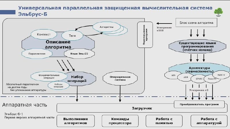 Российский инженер и ученый Борис Бабаян вместе с сыном Евгением работает над проектом по созданию чипа на новой архитектуре «Эльбрус-Б» Планируется, что чип на ней появится к 2027 г. Особенность архитектуры состоит в параллелизме вычислений По заверению разработчиков, она будет превосходить именитые иностранные архитектуры «в 30-200 раз» «Эльбрус-Б» — это параллельная вычислительная система, состоящая из алгоритмического языка, операционной системы и аппаратной архитектуры микропроцессора Эта архитектура разрабатывается как открытая с возможностью привлечения к работе всех заинтересованных участников, в том числе зарубежных Архитектура параллельной системы позволяет обеспечить мощность в 30-200 раз большую, чем зарубежные аналоги на аналогичных технологических нормах Это достигается за счет способности решать большое количество не связанных между собой вычислительных задач одновременно По словам Бабаяна, мощность микропроцессора «Эльбрус-Б», произведенного на технологии 90 нано