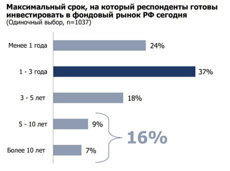 В одном из своих опросов Центральный Банк выявил, что больше половины российских инвесторов не готовы инвестировать в долгосрок, см график ниже. Почти четверть респондентов готовы инвестировать на срок до года, 37% на срок от 1 года до 3 лет, 18% на срок от 3 до 5 лет и только 16% на срок от 5 лет.